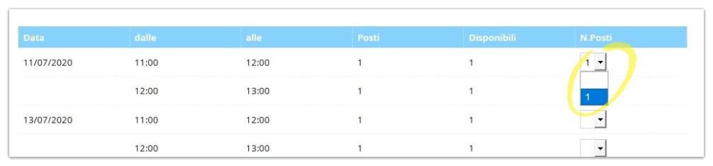 - Seleziona una fascia oraria qualsiasi valorizzando come 1 la tendina di N. posti ► Inserisci: